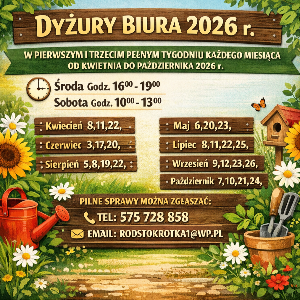 uprzejmie informujemy, że dyżury biura ROD „Stokrotka” w 2026 roku będą odbywać się w pierwszym i trzecim pełnym tygodniu każdego miesiąca, w okresie od kwietnia do października 2026 r.